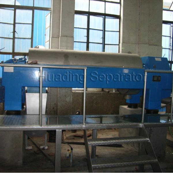 The working principle of the decanter centrifuge is as follows: the bowl and the screw rotate at a high speed in the same direction at a certain differential speed, and the material is continuously introduced into the inner cylinder of the conveying screw from the feeding pipe, and then enters the bowl after being accelerated, under the action of the centrifugal force field, the heavier solids are deposited on the bowl wall to form a sediment layer. The conveying screw continuously pushes the deposited solid phase to the cone end of the rotating bowl and discharges it out of the machine through the slag discharge port. The lighter liquid phase forms an inner liquid ring, which continuously overflows the bowl from the overflow port at the large end of the bowl, and is discharged out of the machine through the liquid discharge port, so as to achieve the purpose of extraction and separation.